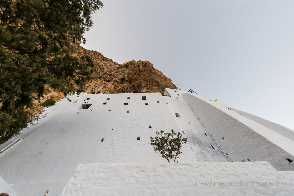 Σ' ένα κακοτράχαλο τοπίο απίστευτης ομορφιάς και αγριάδας, οι άνθρωποι νίκησαν τις αδυναμίες τους και κατάφεραν αυτό που σήμερα φαντάζει σαν ένα μικρό θαύμα. Χτισμένο πάνω σε απότομους βράχους κρέμεται στο κενό πιασμένο λες από ένα αόρατο χέρι. Η μονή χτίστηκε το 1088, με αφορμή για την ίδρυσή της την εύρεση μιας εικόνας της Παναγίας, που έφτασε από το Χόζοβο της Παλαιστίνης, κοντά στους Άγιους τόπους. Οι διωγμοί των χριστιανών τον 9ο αιώνα έφεραν ως εκ θαύματος την εικόνα στην Αμοργό, θέση που όπως λέγεται επέλεξε η ίδια η Παναγία.
