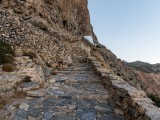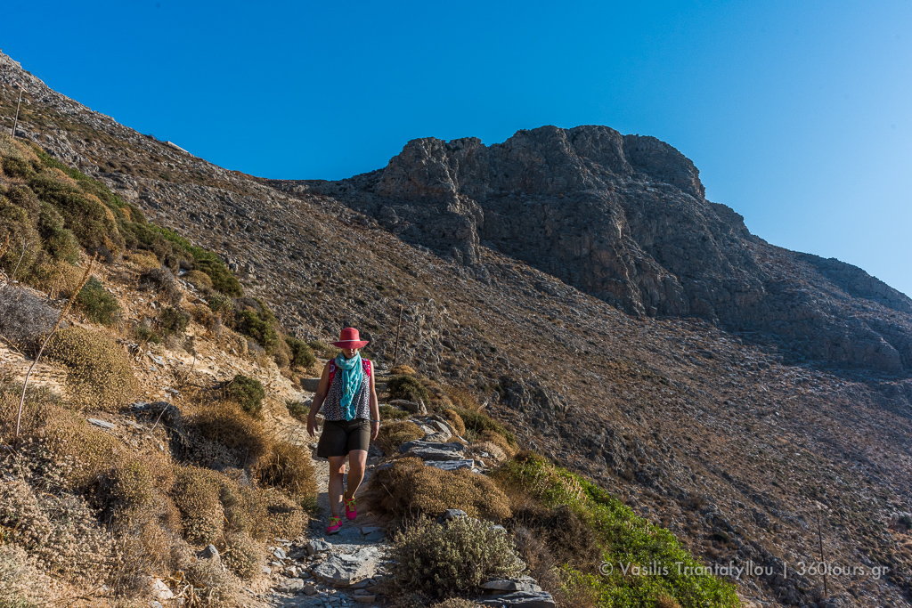Καθώς το αυτοκίνητο που είχαμε νοικιάσει θα το είχαμε στη διάθεσή μας από τις 10 και μετά, βρεθήκαμε λίγο μετά τις 7 το πρωί της επομένης να διασχίζουμε το παλιό καλογερικό μονοπάτι, που ένωνε τη Μονή με τη Χώρα, ώστε να ψάξουμε για τα γυαλιά πριν ανοίξει η Μονή κι αρχίσουν να φτάνουν οι επισκέπτες. Φάγαμε ξανά το λουκουμάκι μας, ήπιαμε τον καφέ που μας πρόσφεραν με φροντίδα και φύγαμε με άδεια χέρια καθώς τα γυαλιά δεν ήταν πουθενά στη Μονή.
