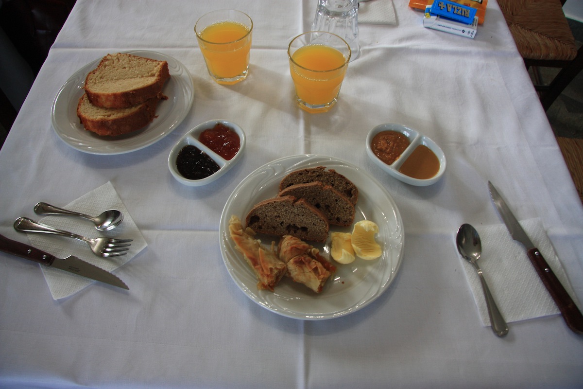 Αυγόφετες, χειροποίητο κέικ, ψωμί από ζέα (παραγωγής τους), μαρμελάδες χειροποίητες, φυστικοβούτηρο που φτιάχνουν στην περιοχή, αυγουλάκια χωριάτικα, μπουγάτσα με τέλειο φύλλο (η περιοχή φημίζεται), βούτηρο παραδοσιακό και ότι άλλο χωρούσε οι κοιλιά μας. Οι γονείς του Νίκου μας υποδέχονταν κάθε απόγευμα όταν επιστρέφαμε από τις εξορμήσεις μας. Εξυπηρετικότατοι και φιλικότατοι άνθρωποι, όπως και ο Νίκος. Το μήλο κάτω από τη μηλιά θα πέσει φυσικά! Ο πατέρας του Νίκου ασχολείται και με τις καλλιέργιες και μπορεί να σας προμηθεύσει με βιολογικά φασόλια (χρήση ζεόλιθου) και αλεύρι ζέας παραγωγής του. Εμείς πείραμε!