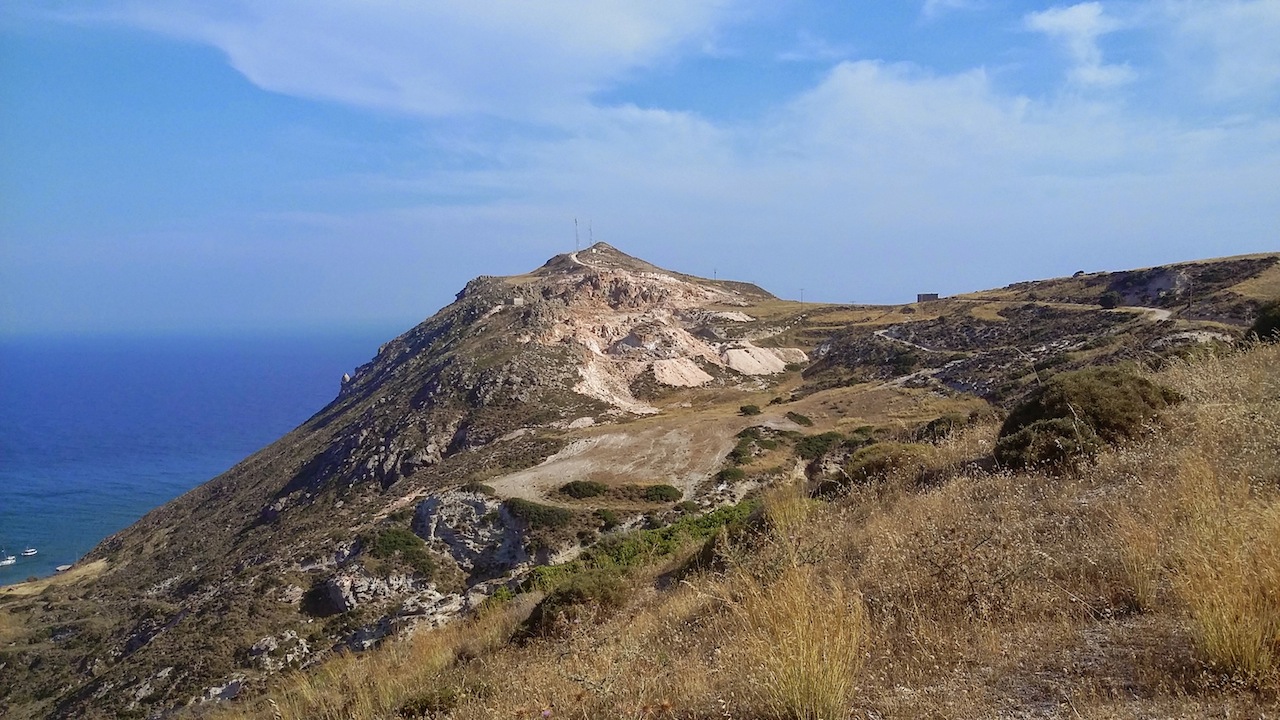 The route is very nice, especially if you go in the afternoon, you only need two hours to ascend and descend. From the top of the volcano we saw the South side of the island from above, hidden beaches and white cliffs, and even the Plaka and the harbor looking towards to the north.