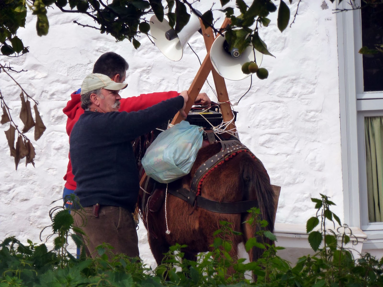 In front of the parade goes the "Donkey", our fabulous leader, which is carrrying a very "advanced" music soundsystems, consisting of a handmade box, plus battery, plus cassete-player, plus two speakers, playing the same cassete each year. We follow the Donkey wherever it goes and same does the "Carnavalos" whom we are leading to hang.